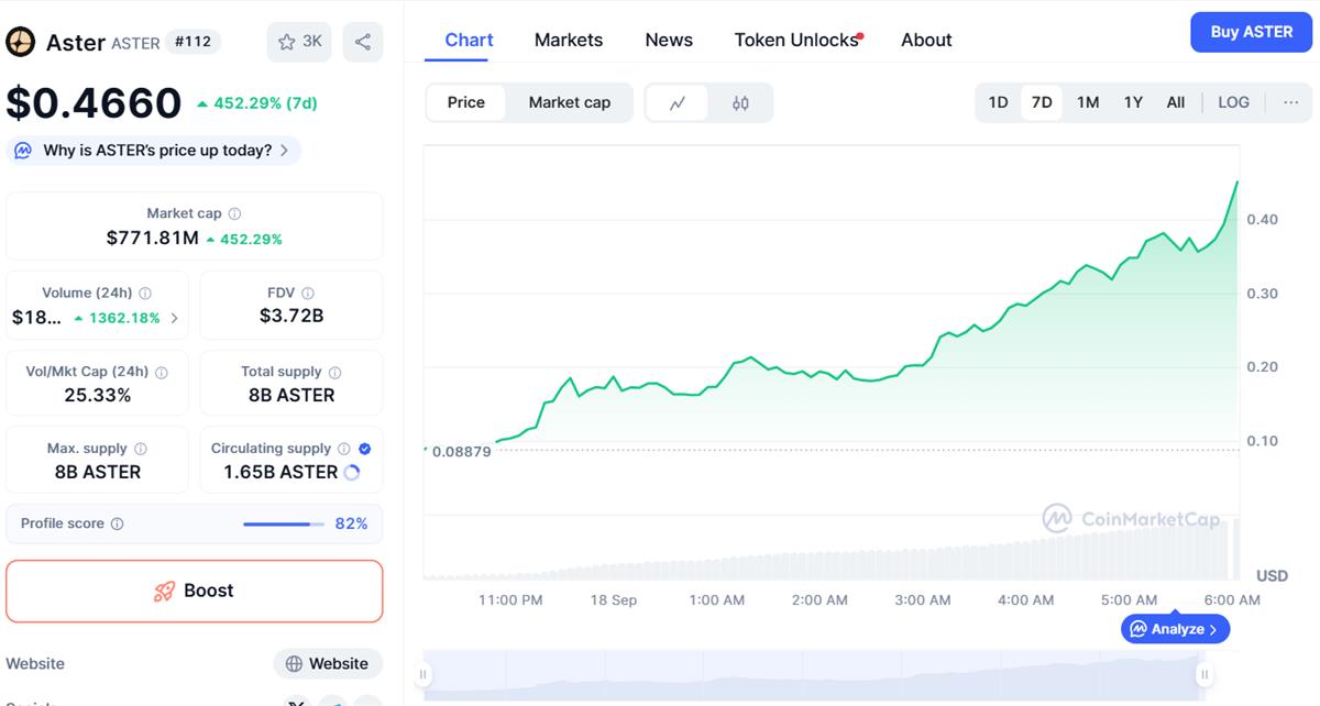 ASTER operates on BNB Chain with contract address 0x000Ae314E2A2172a039B26378814C252734f556A , maintaining a market capitalization of $750 million and fully diluted valuation of $3.6 billion following the initial surge. The token maintains a total supply of 8 billion tokens with 1.65 billion currently in circulation, representing 20.7% of the total supply. Trading volume reached $185 million over 24 hours, with $164 million occurring onchain, demonstrating substantial immediate market interest.