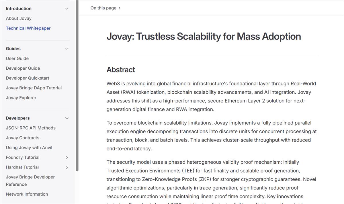The whitepaper outlines Jovay's technical architecture, which employs a hybrid proof system combining Trusted Execution Environments (TEE) and Zero-Knowledge proofs to achieve both scalability and security. The network targets an ambitious throughput of 100,000 transactions per second while maintaining ultra-low fees, addressing key limitations that have hindered blockchain adoption in traditional finance.