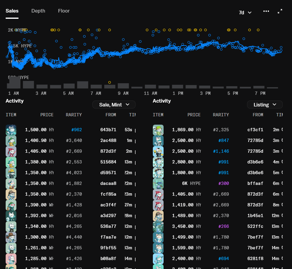 Current market metrics reveal remarkable holder behavior patterns. With 4,031 unique holders maintaining an 87.6% distribution rate, the collection shows minimal whale concentration - unusual for high-value NFT projects. This suggests holders view their NFTs as long-term community membership tokens rather than short-term trading vehicles. The sustained floor price around 1,315 HYPE tokens ($62,000) with peaks at $100,000 indicates strong conviction among holders despite significant unrealized gains.