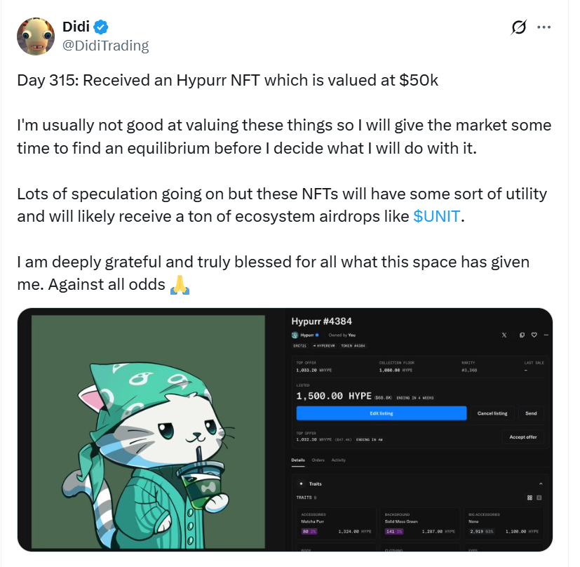 The opt-in mechanism during the Genesis Event proved particularly brilliant from a game theory perspective. By presenting users with a binary choice between "tokens only" or "tokens plus NFT," Hyperliquid created an implicit value signal. Those who chose the NFT option demonstrated additional commitment to the platform's ecosystem beyond pure financial returns. This self-selection mechanism concentrated the NFTs among users most likely to hold and value them as community status symbols rather than immediately liquidate them.