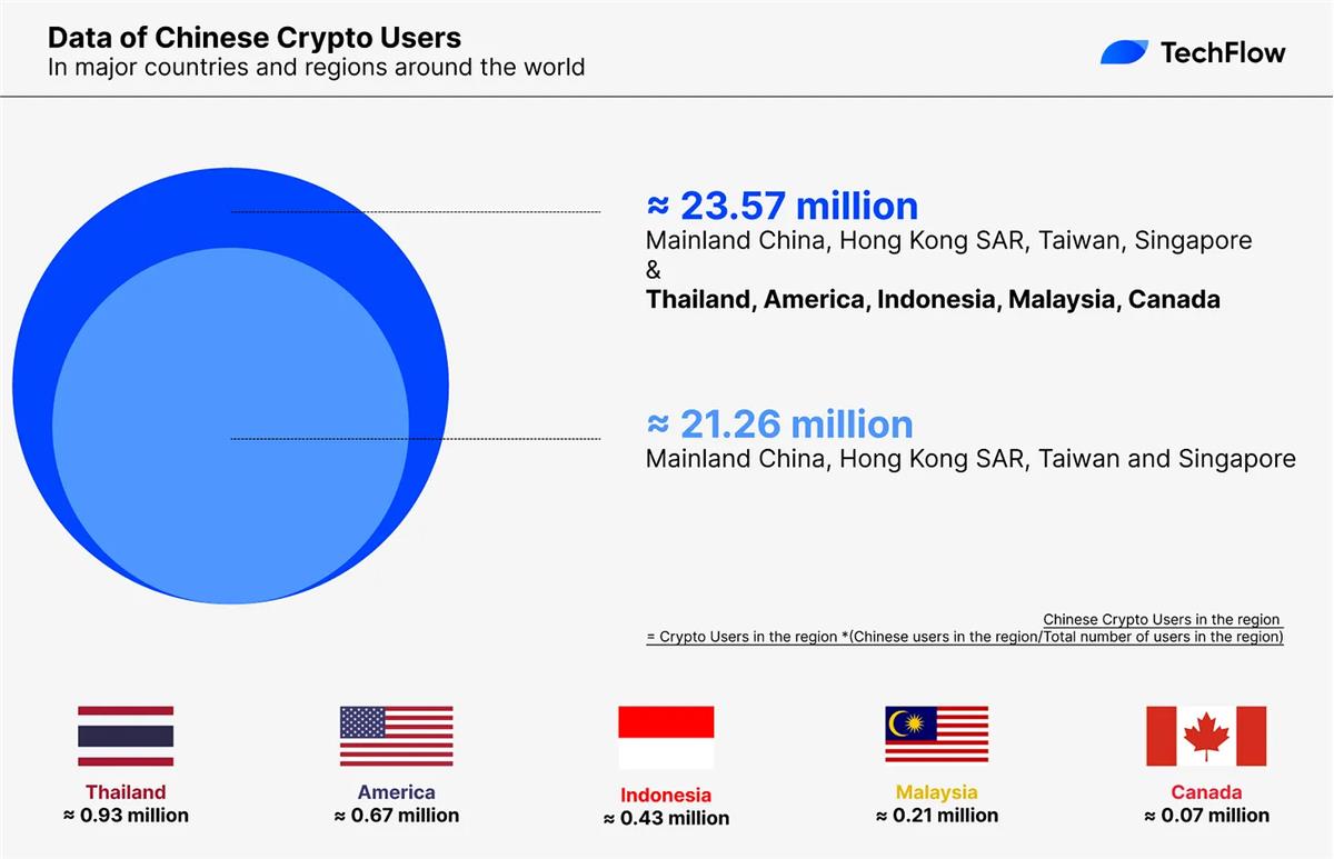 If this data includes the proportion of Chinese in Indonesia, Thailand, Malaysia, the United States, and Canada, the number of users that Chinese-language content can reach is at least 23.57 million (the calculation formula is: Number of cryptocurrency users in that region * (Number of Chinese speakers in that region/Total population of that region)).