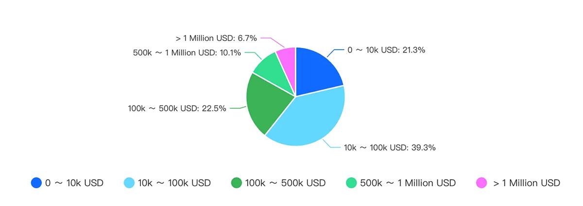 1-Overall, Chinese-speaking users have the highest investment proportion in the cryptocurrency market within the range of 10,000 to 100,000 USD, accounting for 39.3%, followed by 100,000 to 500,000 USD, which accounts for 22.5%.