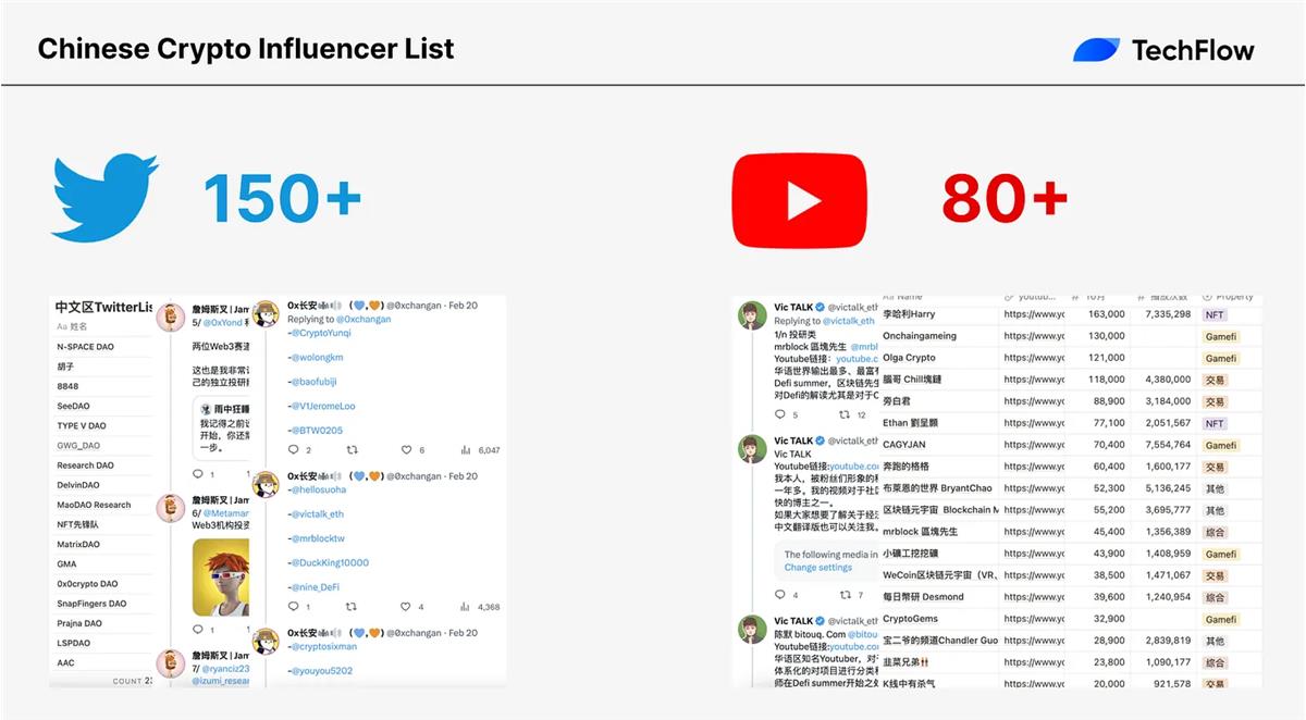 In terms of communities and Influencers, WeChat, Weibo, and Bilibili were important information sources for Chinese-speaking users. However, due to policies, Chinese users' main sources of information have gradually shifted to international channels such as Twitter and YouTube. Many communities and Influencers that were previously on WeChat, Weibo, and other channels have also gradually migrated to international channels. Therefore, we mainly list Chinese-speaking Influencers and communities on Twitter and YouTube.
