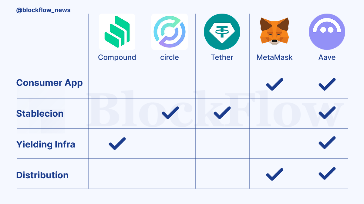 Compare this to competitors. Compound has a powerful protocol but no consumer app and no stablecoin. Circle and Tether issue stablecoins but do not control the yield-generating infrastructure. MetaMask has distribution but relies on third-party protocols for financial services. Aave is the first DeFi protocol to integrate all four layers. That structure is closer to how traditional banks operate: they issue deposits, manage lending, control the customer interface, and navigate regulation. If DeFi is going to compete with traditional finance, it may need to adopt a similar model.