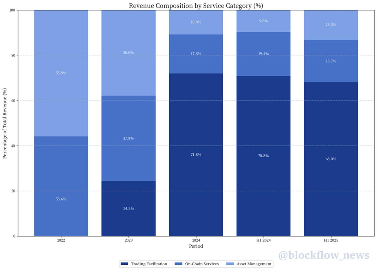 Emerging verticals are growing, but slowly. While on-chain services and asset management command higher gross margins, their scale is currently insufficient to hedge against the volatility of the trading desk.
