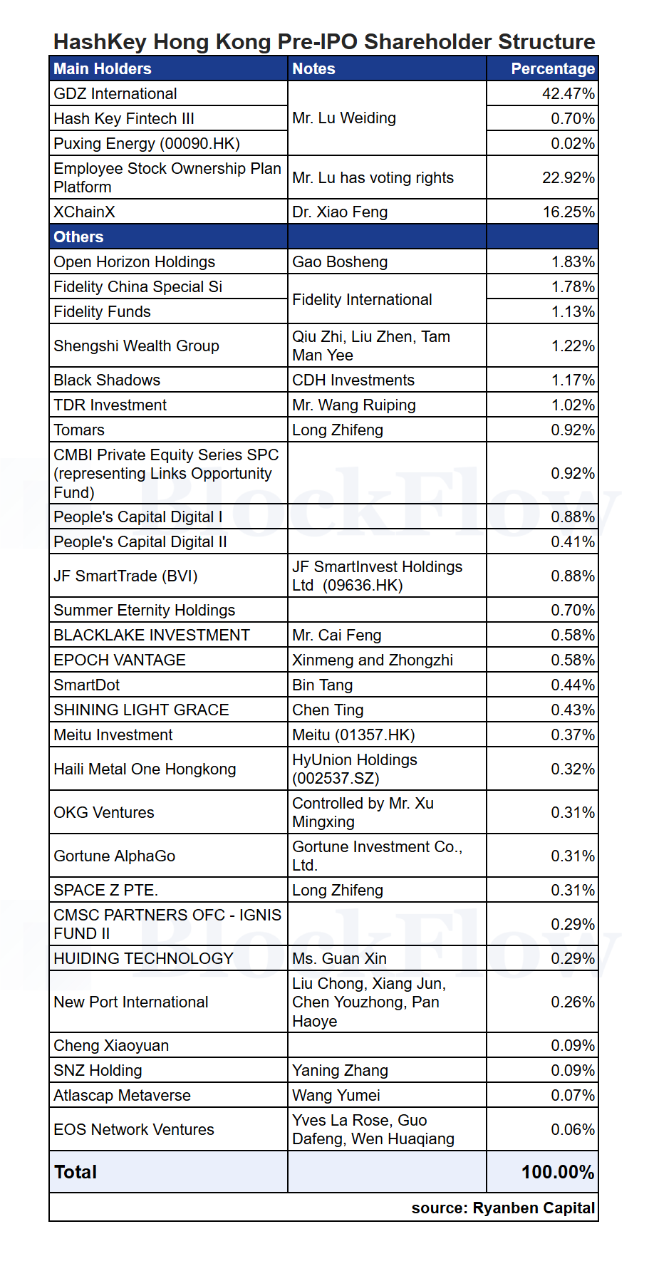 Beyond the prospectus, according to Ryanben Capital's disclosure of HashKey shareholder percentages, we have more detailed information for cross-reference.